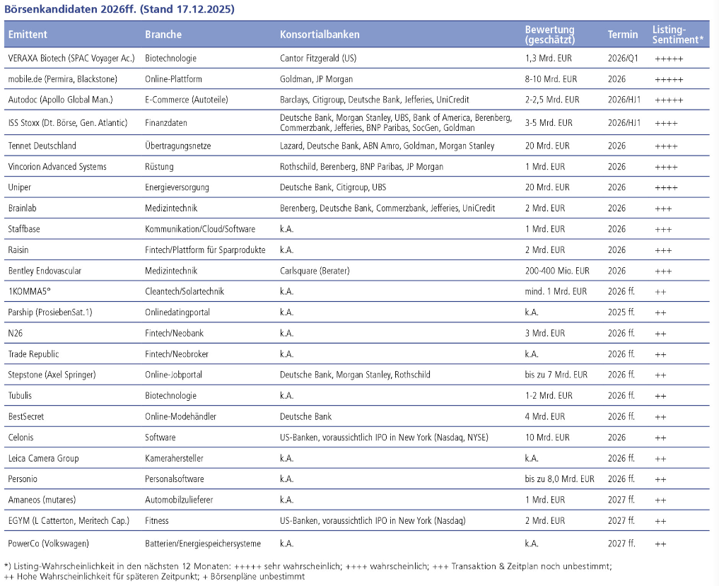 Für 2026 gehen sowohl EY als auch Kirchhoff Consult in ihren Reports von rund zehn deutschen Börsengängen aus. „Nach dem Jahr 2025 mit mehreren abgesagten Börsengängen und einer insgesamt verhaltenen Emissionstätigkeit könnte sich der IPO-Markt 2026 wieder beleben. Für das kommende Jahr zeichnet sich bereits eine Reihe potenzieller Börsenkandidaten ab, die einen Gang an den Kapitalmarkt prüfen“, so Jens Hecht, Managing Partner bei Kirchhoff Consult. Konkret zählt er dazu „das deutsche Software-Start-up Celonis sowie Deutschlands größten Onlinemarktplatz für Fahrzeuge, mobile.de.“
