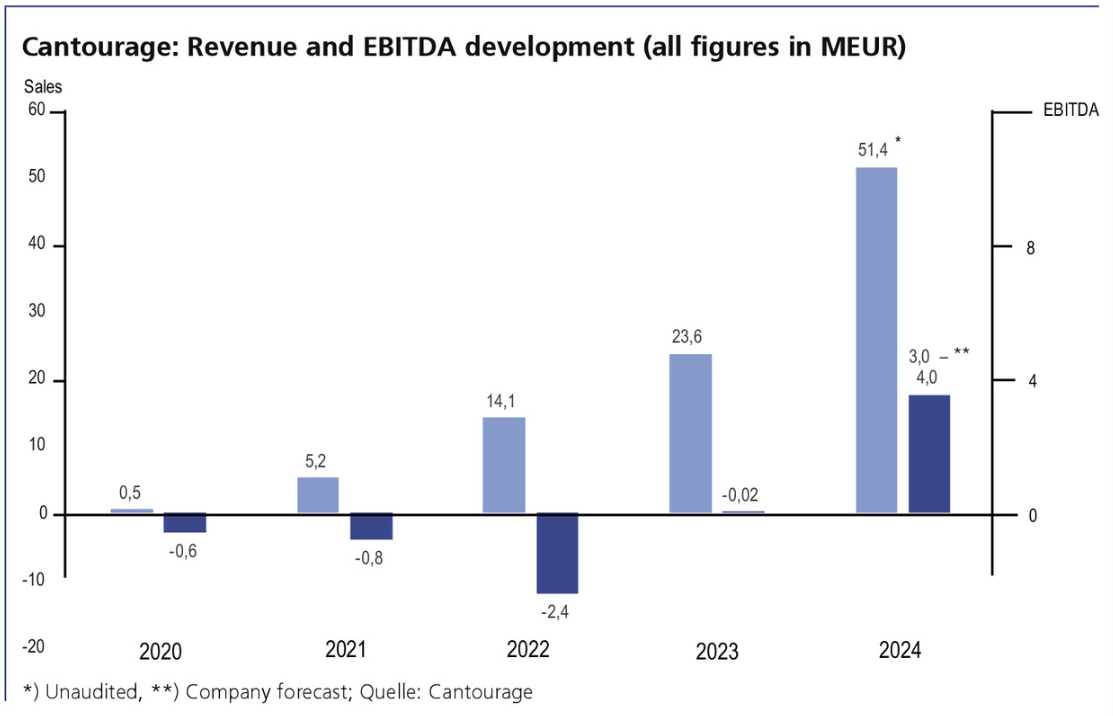 Vor diesem Hintergrund lohnt der Blick auf die bisherigen deutschen Cannabis-Pure-Plays an der Börse: Die Cantourage Group SE nahm im November 2022 den Weg über ein nicht-öffentliches Angebot ins Scale-Segment der Frankfurter Wertpapierbörse. In den ersten Wochen setzte ein regelrechter Hype um das Unternehmen ein, das die Cantourage-Aktie auf über 200 Mio. EUR Börsenwert katapultierte. Inzwischen gelang es dem Berliner Start-up (Gründung 2019), den Umsatz wesentlich zu steigern und seit 2024 auch positive Ergebnisse zu erzielen, während der Börsenwert bei unter 40 Mio. EUR liegt.