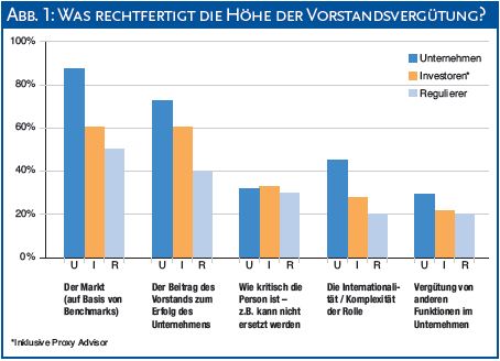 Fast alle Unternehmen und auch eine Vielzahl von Investoren und Regulierer rechtfertigen die Höhe der Managergehalter durch Marktvergleiche. Die Mehrheit führt als weiteren wichtigen Punkt den individuellen Beitrag des jeweils Einzelnen an. Deutsche Investoren hinterfragen in Bezug auf Marktvergleiche jedoch kritisch, ob immer die richtigen Märkte, die auch die entsprechende Rolle im Unternehmen abbilden, als Referenz hinzugezogen werden.