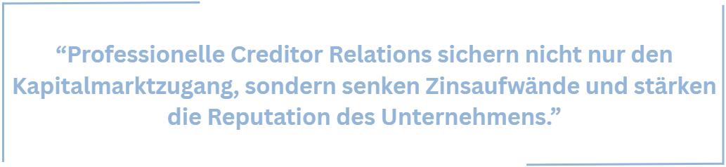 Professionelle Creditor Relations sichern nicht nur den Kapitalmarktzugang, sondern senken Zinsaufwände und stärken die Reputation des Unternehmens – weit über den Finanzbereich hinaus. Mehr noch: Sie können zu einem echten Profit Center werden.
