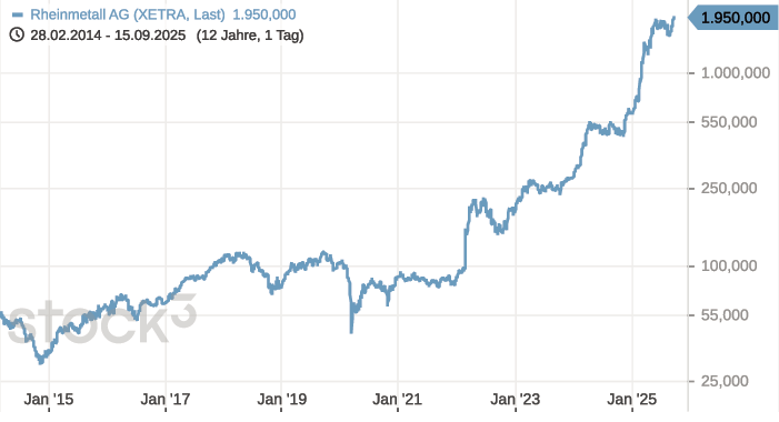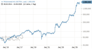 Ein weiterer Player der deutschen Rüstungsbranche ist das in Taufkirchen beheimatete Unternehmen HENSOLDT (Market Cap 11,1 Mrd. EUR), das sich auf die Entwicklung und Herstellung von Sensoren für Verteidigungs- und Sicherheitsanwendungen spezialisiert hat. Ende Juli 2025 konnte das Unternehmen beim Auftragsbestand erstmalig das Überschreiten der Marke von 7 Mrd. EUR melden. Der Umsatz für das Geschäftsjahr 2025 dürfte laut HENSOLDT-CEO Oliver Dörre zwischen 2,5 Mrd. und 2,6 Mrd. EUR liegen.