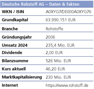 Mit einem Kurs/Buchwert-Verhältnis von 1,1 ist die Deutsche Rohstoff-Aktie aktuell günstig bewertet, zumal 70 Mio. EUR Cash in der Firmenkasse liegen. Ebenfalls positiv fällt die deutlich gestiegene Handelsliquidität der Aktie ins Gewicht: In diesem Jahr wurden durchschnittlich 17.359 Aktien pro Tag gehandelt – nach 12.868 Stück im Jahr 2024 – und damit deutlich mehr als zuvor.