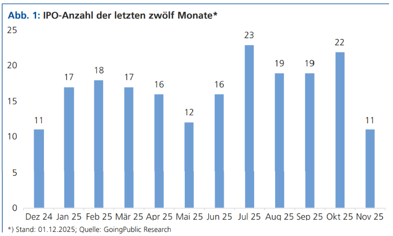 Im Verlauf des Jahres ist der US-IPO-Markt nahezu kontinuierlich angezogen, sodass bis Ende November ein Zuwachs gegenüber dem Vorjahreszeitraum von 47 % zu Buche steht. Die 200er-Marke dürfte zum Jahresende noch gerissen werden; kein Vergleich zu den leider dürftigen sieben Neuemissionen in Deutschland, aber auch den 100 Börsendebüts in Europa. Dabei muss festgestellt werden, dass am US-IPO-Markt jedoch auch überproportional viele volatilere Unternehmen, u.a. auch aus Asien, dem Kapitalmarkt beitreten. Dieser Beitrag erscheint auch in der neuen Ausgabe GoingPublic 4/25. Zu älteren Ausgaben geht es hier.