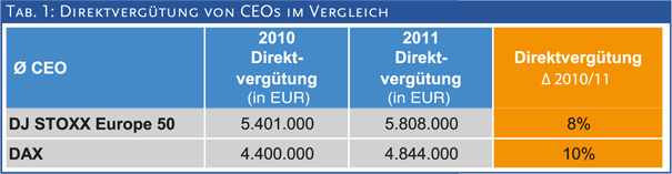 Die deutlich verbesserte Gewinnsituation DAX-notierter Unternehmen spiegelt sich auch in der Vergütung ihrer Vorstände für das Geschäftsjahr 2011 wider. So stieg der durchschnittliche Gewinn je Aktie um 7%. Die Direktvergütung (Bezüge ohne Altersversorgung und Nebenleistungen) der Vorstandsvorsitzenden wuchs um 10% auf durchschnittlich ca. 4,8 Mio. EUR. Die Steigerung ist überwiegend auf die vom Unternehmenserfolg abhängige variable Vergütung zurückzuführen. Hingegen ist die durchschnittliche Altersversorgungszuwendung auf 540.000 EUR gesunken (2010: 697.000 EUR). Insgesamt werden die DAX-Unternehmenslenker etwas geringer als ihre Peers in den größten Unternehmen anderer europäischer Länder vergütet, die durchschnittlich 5,8 Mio. EUR verdienen.