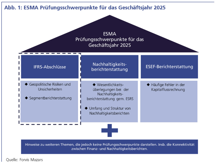 Die ESMA hat ihre European Common Enforcement Priorities (ECEPs) für den IFRS-Abschluss 2025 veröffentlicht. Im Fokus stehen die Auswirkungen geopolitischer Risiken und Unsicherheiten sowie die Qualität der Segmentberichterstattung. Unternehmen müssen darlegen, wie politische und wirtschaftliche Unsicherheiten ihre Finanzberichterstattung, beeinflussen und detaillierte, unternehmensspezifische Angaben hierzu machen.