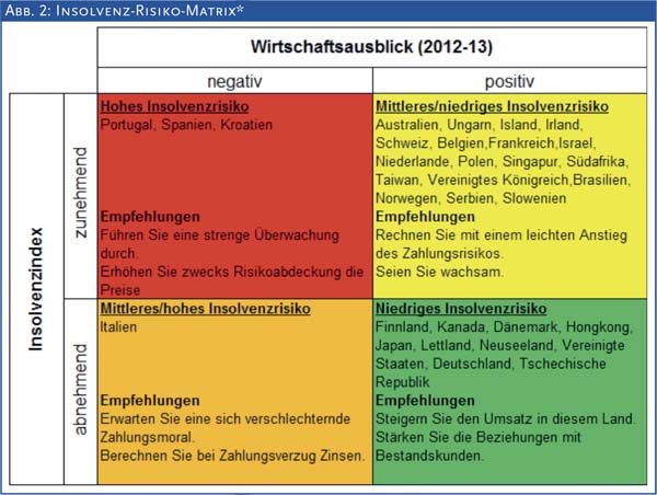 In Gänze betrachtet führt das zu einer erneuten Volatilität der Anlage- und Warenmärkte und anziehenden Kreditkonditionen, was das weltweite Geschäftsklima trüben wird. Der Nettoeffekt als solcher wäre ein schwaches weltweites Wachstum im H1/2012 und bis in das H2/2012 hinein und damit verbunden ein weiterhin hohes Insolvenzrisiko. Dies wird die Gewinnmargen der Unternehmen schwächen und zu einer steigenden Insolvenzrate führen. Zu den Ländern mit erhöhtem Insolvenzrisiko gehören Kroatien, Portugal und Spanien.Darüber hinaus verdichten sich die Anzeichen einer möglichen Rezession im Euro-Raum. Die Schuldenkrise einiger Euro-Länder ist noch lange nicht ausgestanden. Neben Griechenland stehen auch die anderen Länder an den südlichen Rändern der Euro-Zone weiter vor der großen Aufgabe, ihren Haushalt in Ordnung zu bringen. Wirtschaftswachstum ist für diese Länder derzeit nicht in Sicht. Darüber hinaus gefährden sie die Stabilität des Euro und der europäischen Finanzmärkte. Und sie bremsen das Wachstum der gesamten Euro-Zone.