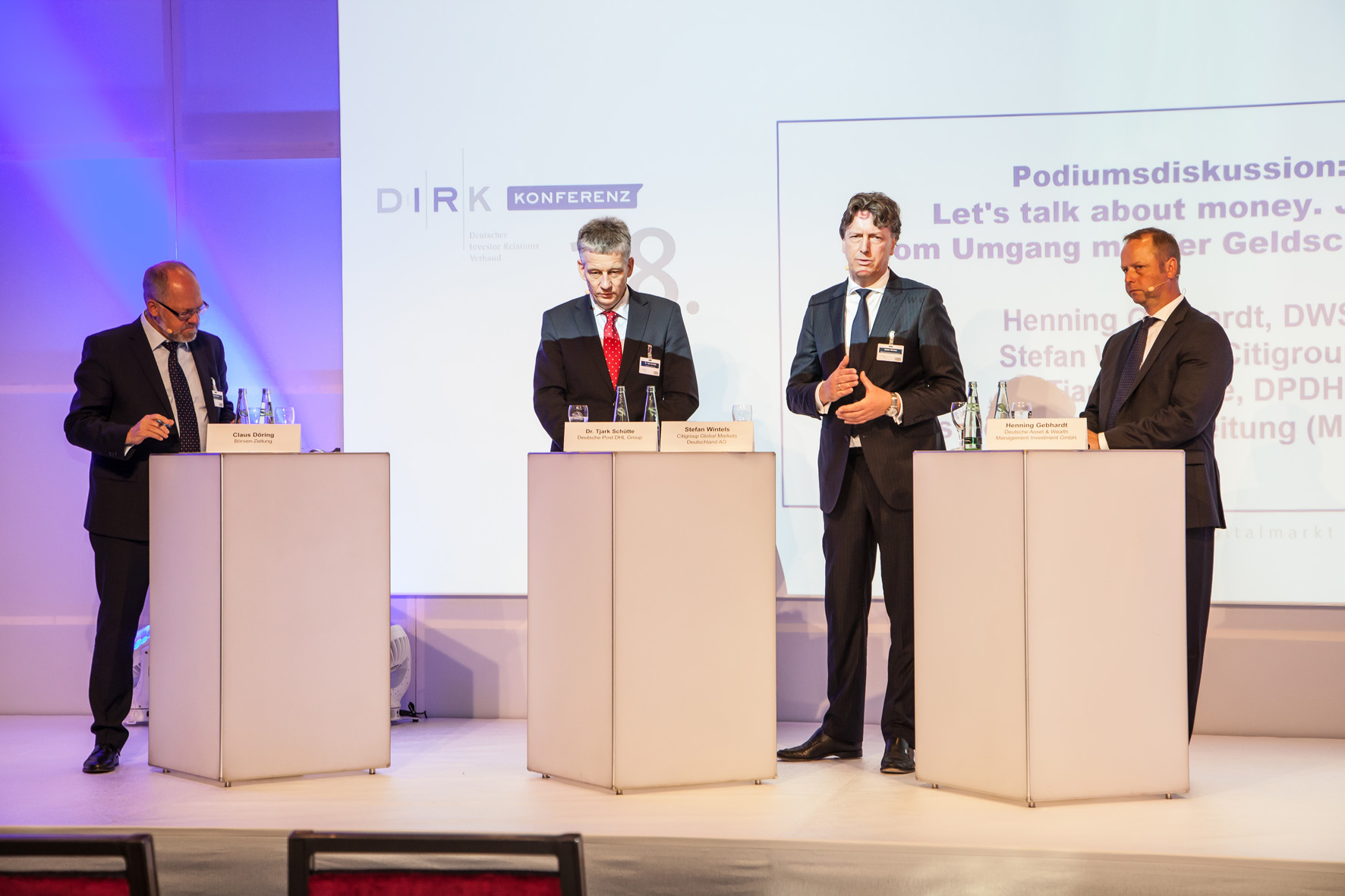 Hauptthema Nr. 1 war die derzeitige Geldpolitik der  Notenbanken und die damit verbundene steigende (Überschuss)Liquidität. Die Aufgaben des IR-Managers werden in einer Welt des billigen Geldes damit aber keinesfalls überflüssig. „Wir spüren zwar die Schattenseite der Geldschwemme, z.B. in Form hoher Pensionsverbindlichkeiten, doch die Kernaufgabe unserer Arbeit bleibt die gleiche“, betont Dr. Tjark Schütte, Abteilungsleiter Investor Relations für Privatanleger der Deutschen Post DHL.