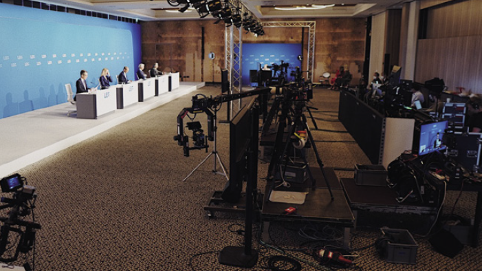 Ein konkretes Beispiel aus unserem Arbeitsalltag zeigt, wie modulare Systeme nachhaltiges Arbeiten ermöglichen. Bedingt durch die Coronapandemie fand die erste virtuelle Hauptversammlung der LEG Immobilien SE in einem einfachen Format in den Räumen der damaligen Hauptverwaltung statt. Die Hauptversammlung 2021 wurde erneut als virtuelles Format im Van der Valk Hotel Düsseldorf umgesetzt, diesmal mit dem Anspruch, mit dem damaligen Konzept auch die Weichen für die Zukunft zu stellen. Für die Umsetzung entwickelten wir eine modulare Bühnengestaltung, die sowohl funktionale Anforderungen als auch die digitale Inszenierung berücksichtigte.