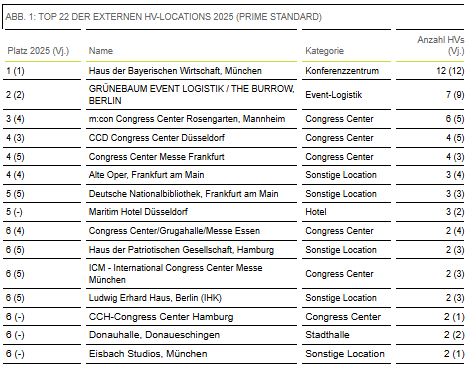 Dabei ist die Nutzung von HV-Veranstaltungsräumen noch breiter als bisher ausgefallen. Außer in München mit dem HBW Conference Center, Berlin (GRÜNEBAUM) und eventuell noch Mannheim (m:con) lässt sich nirgends eine deutlich sichtbare Konzentration auf einzelne Locations ausmachen. Hingegen finden sich unter den Top-22-Locations mit den meisten Hauptversammlungen allein 14 Örtlichkeiten, in denen dieses Jahr zwei Aktionärstreffen stattfanden. Auch hier regiert also die Vielfalt.