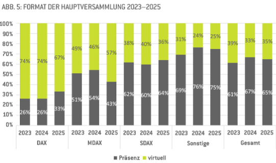 Beim HV-Format gab es 2025 viel mehr Wechsler vom einen ins andere Format als bisher, und zwar in beide Richtungen. Immerhin zeigt sich, dass 2025 bei den DAX-Unternehmen das Präsenzformat wieder leicht dazugewonnen hat, während im MDAX umgekehrt das virtuelle Format in der Gunst zulegen konnte.