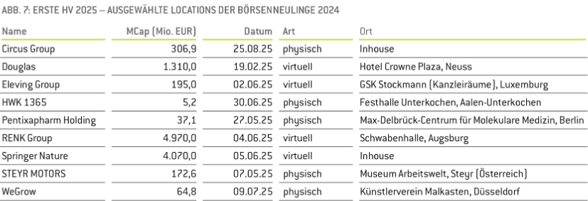 rege das Format ihrer Aktionärstreffen gewechselt, sondern auch die Location. Vielfalt gab es auch in der Fläche: Hauptversammlungen verteilten sich auf Veranstaltungsräume im gesamten Land, nur in wenigen Städten finden sich dominierende Locations. Was auffällt: Bei DAX-Konzernen lässt sich wieder eine stärkere Tendenz zur Präsenz-HV ausmachen – und wer seine Aktionäre virtuell trifft, tut dies vielfach aus den eigenen Räumlichkeiten heraus. Dieser Artikel ist im HV Magazin 4/25 erschienen.
