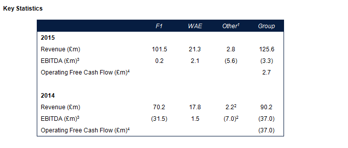 Die seit 2011 im Entry Standard der Frankfurter Börse notierte Williams Grand Prix Holdings veröffentlichte gestern ihre Geschäftszahlen für 2015 und verzeichnete dabei ein deutliches Wachstum: So stieg der Umsatz der Gruppe im letzten Jahr um 40% auf 125,6 Mio. GBP. Auch das EBITDA verbesserte sich von -37 Mio. GBP auf -2,7 Mio. GBP im Gesamtjahr 2015.