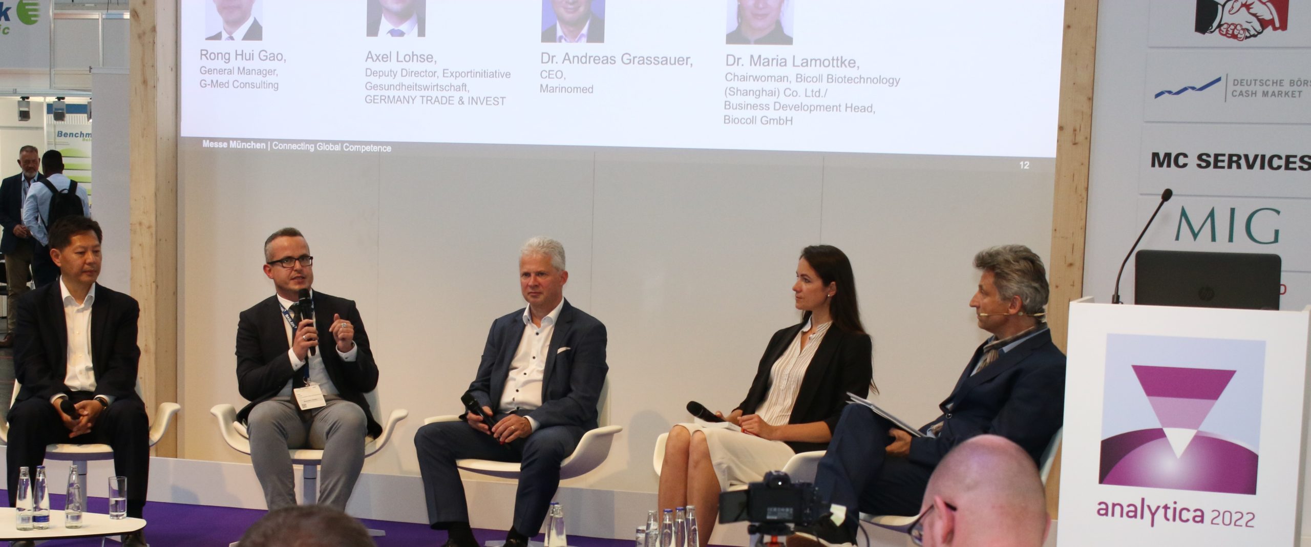 Im anschließenden Panel „Crossborder Investments Deutschland-China“, gab Georg von Stein, mit seinen Gästen einen tieferen Einblick in die Materie. Als Unternehmer mit „China-Erfahrung“ kamen dabei Dr. Andreas Grassauer, CEO von Marinomed, und Dr. Maria Lamottke von der Bicoll Biotechnology (Shanghai) zu Wort.